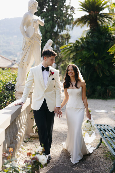 Their first look took place in the gardens of Villa Durazzo, a historic estate overlooking the harbor. Surrounded by lemon trees and sculpted stone pathways, the couple’s portraits felt cinematic, every frame balancing architectural structure with soft romance. Krizia’s gown moved effortlessly against the villa’s grand marble terraces, her minimalist aesthetic enhanced by the lush green gardens and blush-toned facades of the villa. Nick’s timeless suit and polished style grounded the scene, creating a perfect visual contrast that reflected both elegance and strength. This portion of the day, captured with the artistry of SCR Films alongside Cacie Carroll Photography, embodied everything an Italian destination wedding should feel like: editorial yet deeply personal, emotional yet refined.